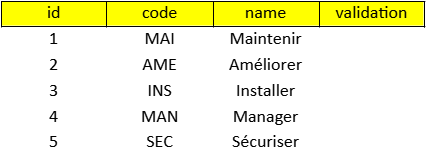 Etablir la liste des compétences à valider selon un principe simple : chaque compétence est représentée par un identifiant numérique, un code ou abréviation, un libellé descriptif .