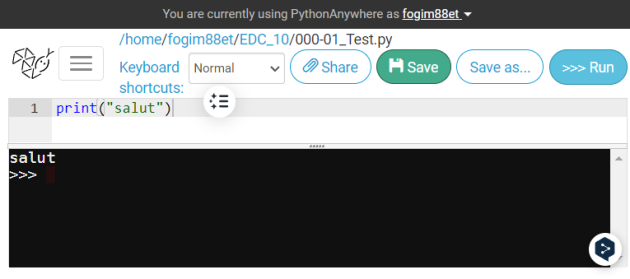Directories) un dossier nomméEDC_10.EDC_10.files) saisir le nom de fichier000_01_test.py(Attention à ne pas oublier l'extension .py)new filepour valider la création et accéder à la saisie du code (cf image ci-dessous pour taper le code)savepour enregistrer le code saisi.runpour exécuter le code.La zone en fond noir est la console qui permet de voir le processus d'exécution du code.
