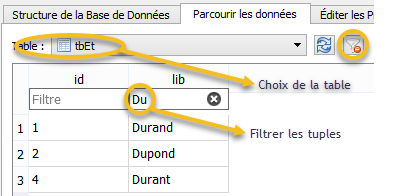 Structure de la base de données:Observez le contenu des tables avec l'onglet