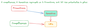 Une UE est attachée à un et un seul semestre, et à une et une seule compétence.